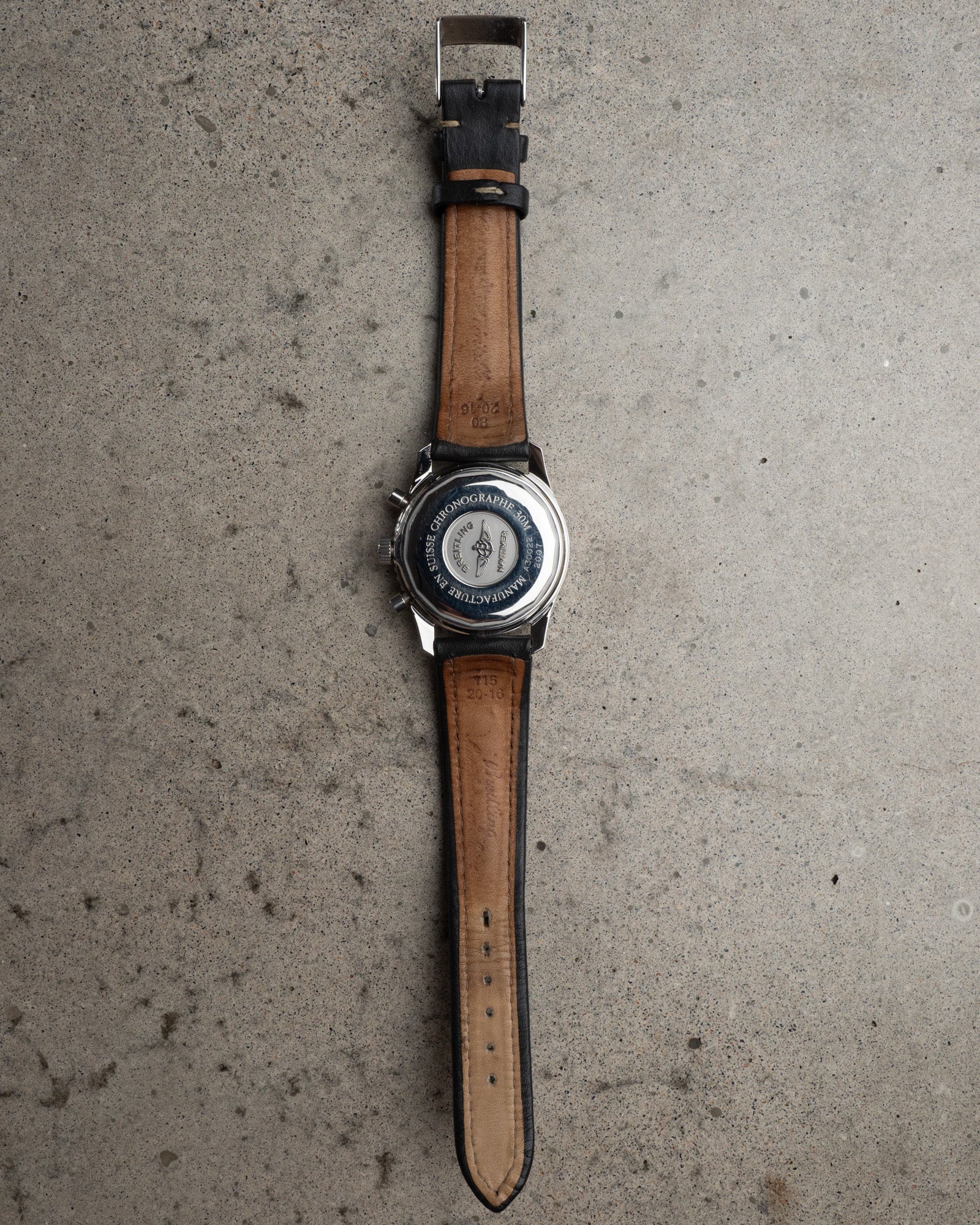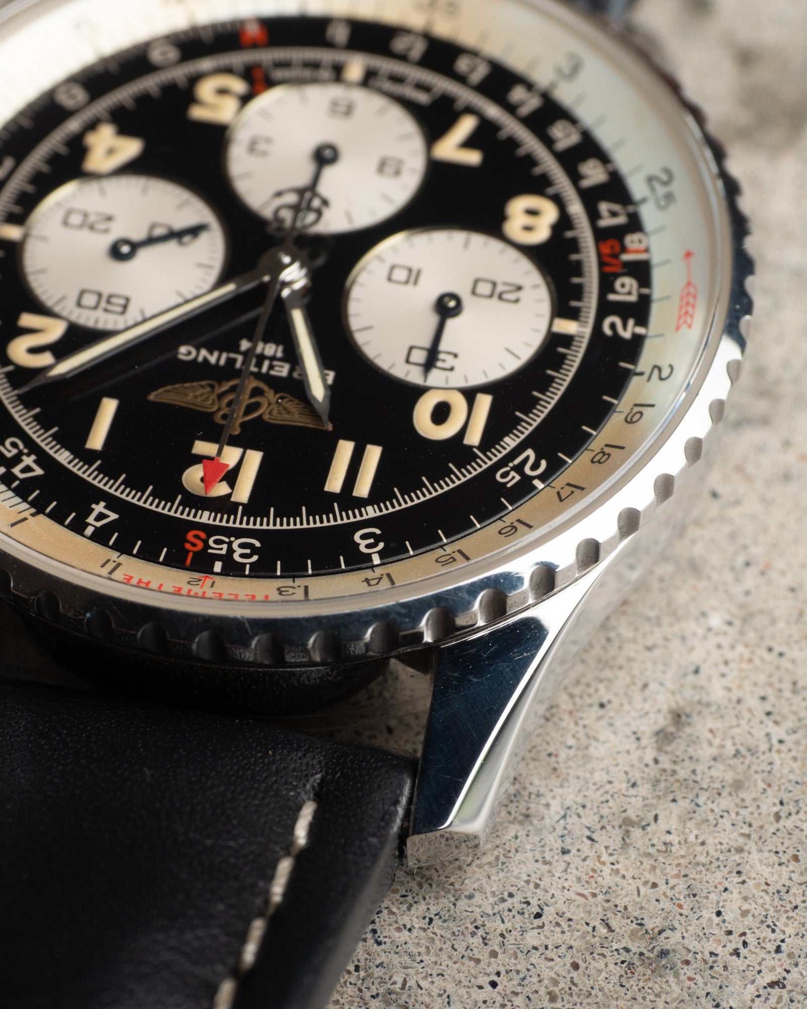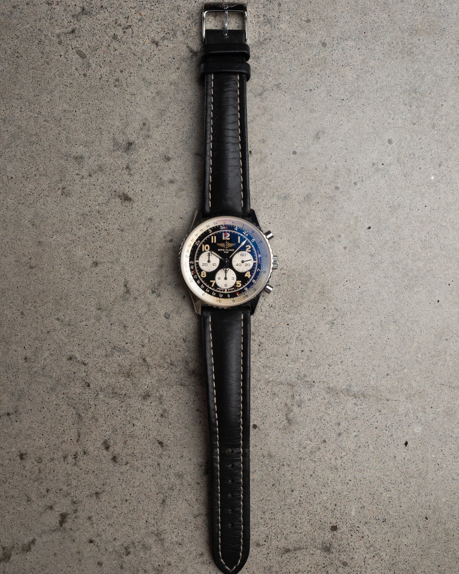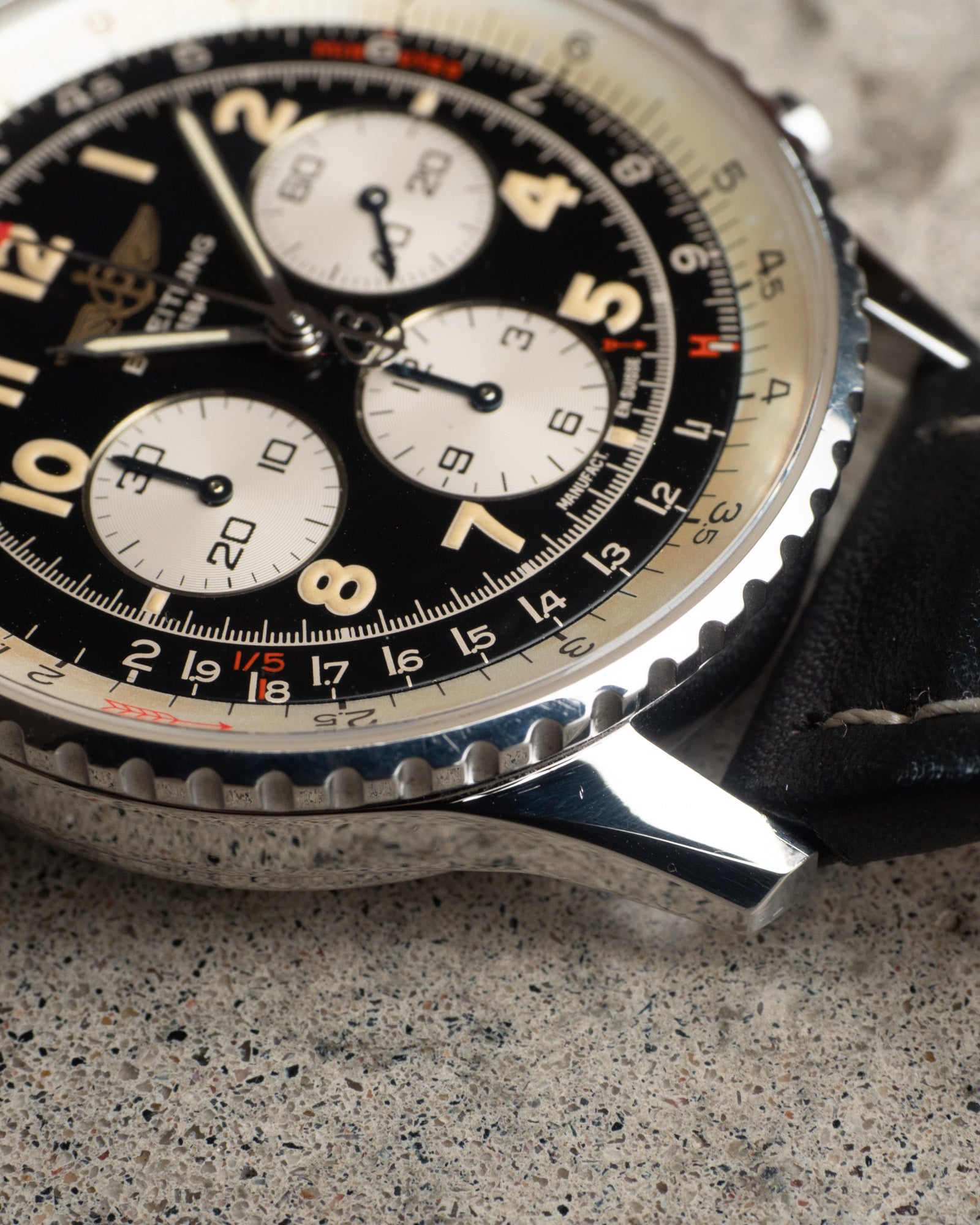 This Breitling Navitimer 92 reference A30022 is a refined take on the brand’s iconic aviation chronograph, introduced in 1992 (hence the name). With its 38 mm stainless steel case, it offers a more wearable interpretation of the Navitimer design, while retaining the model’s unmistakable rotating bezel and chronograph functionality. However, the bezel now features a simplified telemeter scale, similar to the Navitimer's predesessor, the 1950s Chronomat. The black dial is complemented by tritium lume that has aged into a beautiful custard patina, giving the watch a rich vintage character. The case remains in excellent condition, and the crystal’s anti-reflective coating shows almost no signs of wear. It is offered on its original black calf leather strap with matching Breitling buckle.