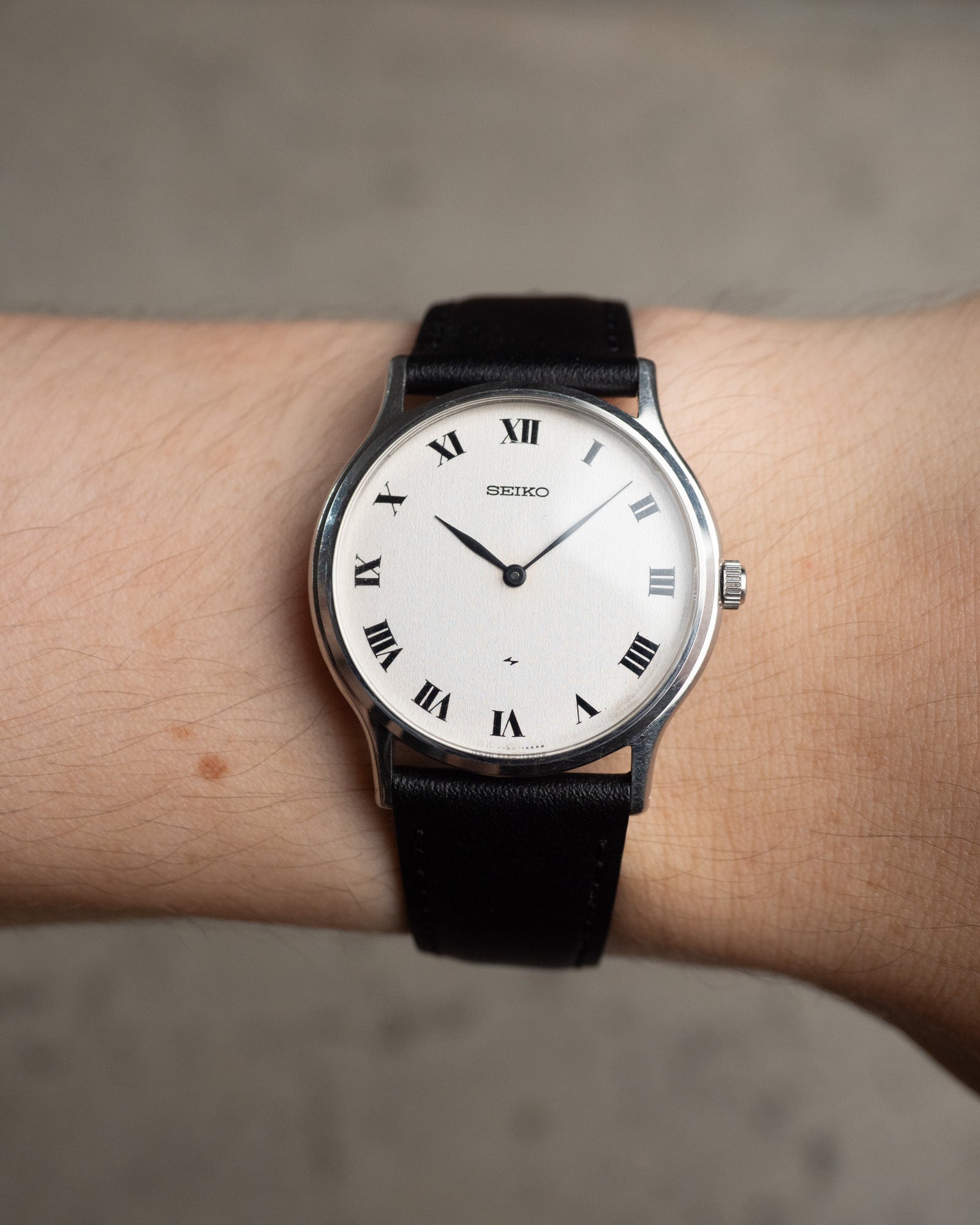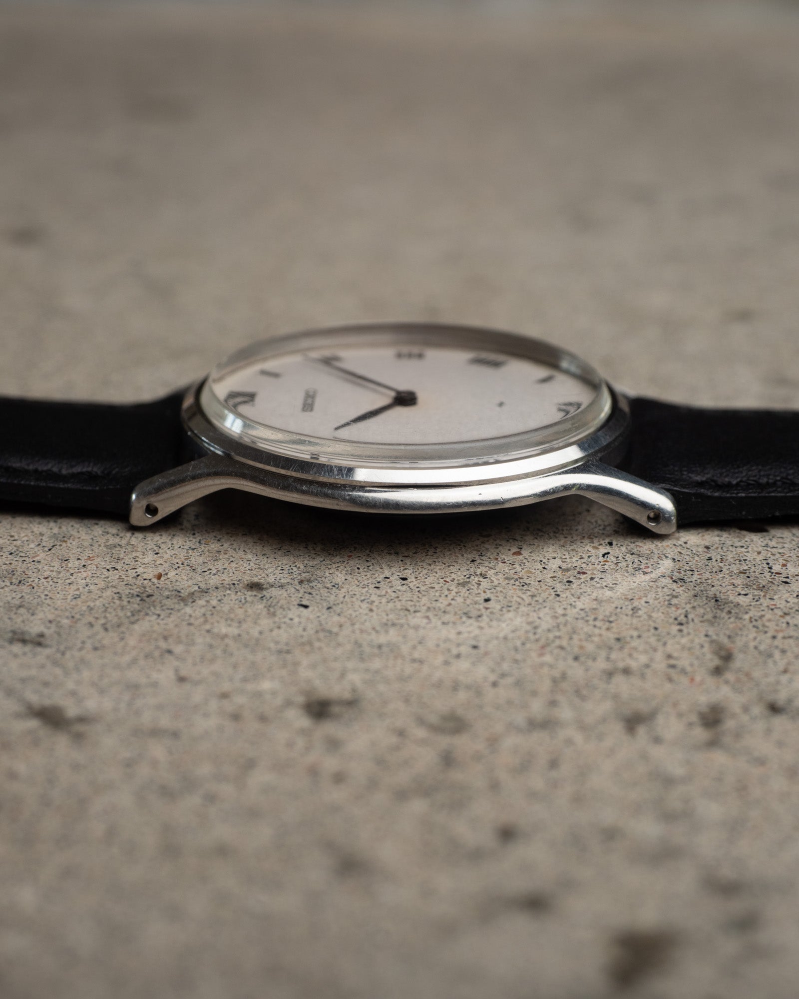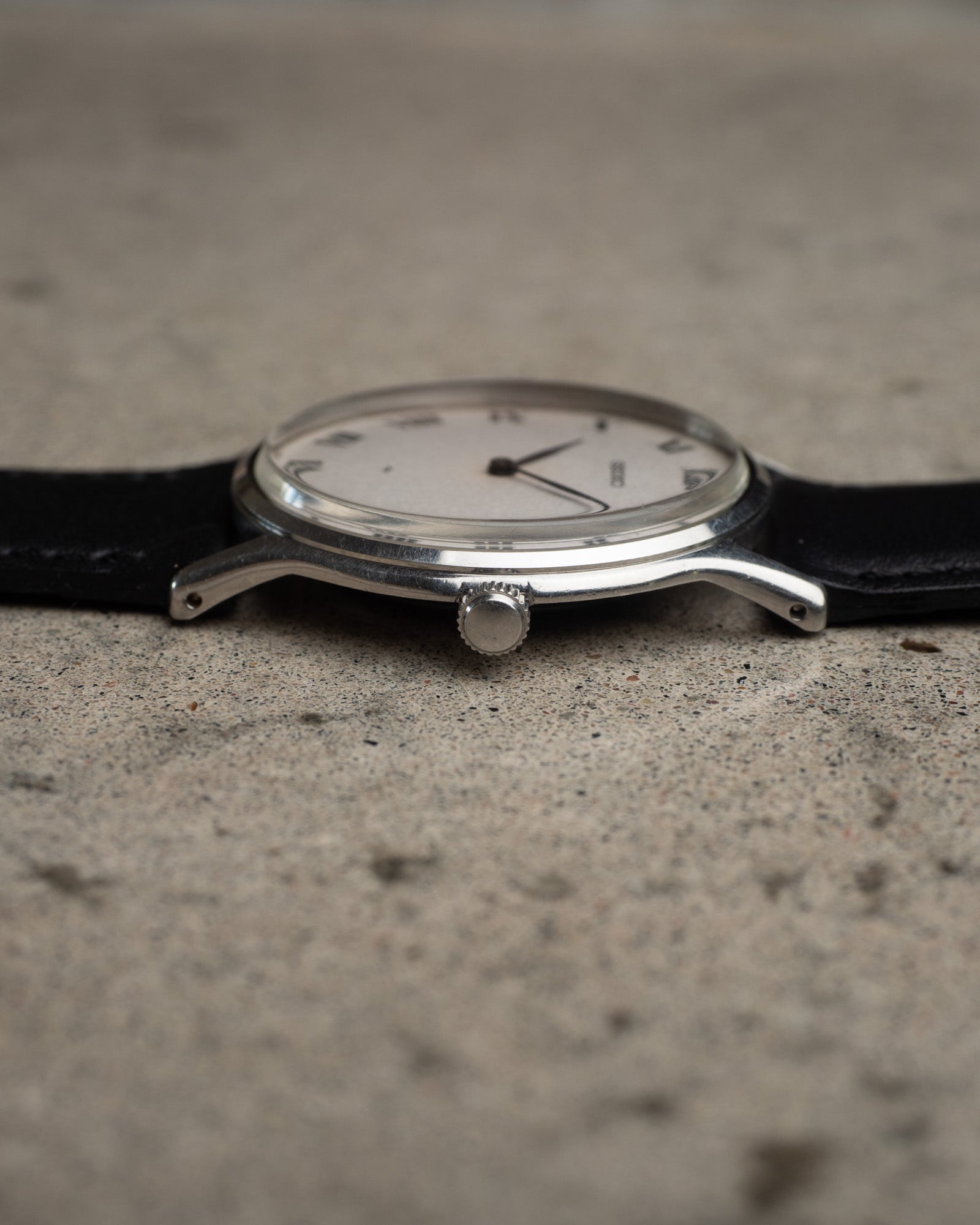 This Seiko Chariot reference 2220-0480 from 1974 is a refined and minimalist dress watch, showcasing the brand’s attention to detail during the golden age of Japanese watchmaking. The 33 mm stainless steel case frames a beautiful silver dial, with a subtle texture that resembles traditional Japanese washi paper. Painted black Roman numerals provide a crisp contrast, giving the dial a timeless elegance. This example has been inspected and regulated by our watchmaker and is running very smoothly. It is fitted with an aftermarket black calf strap and buckle.