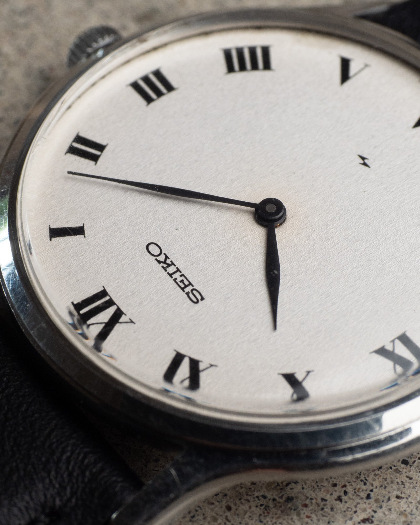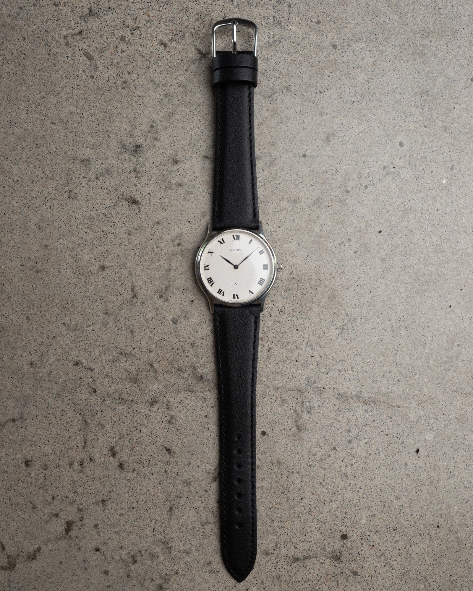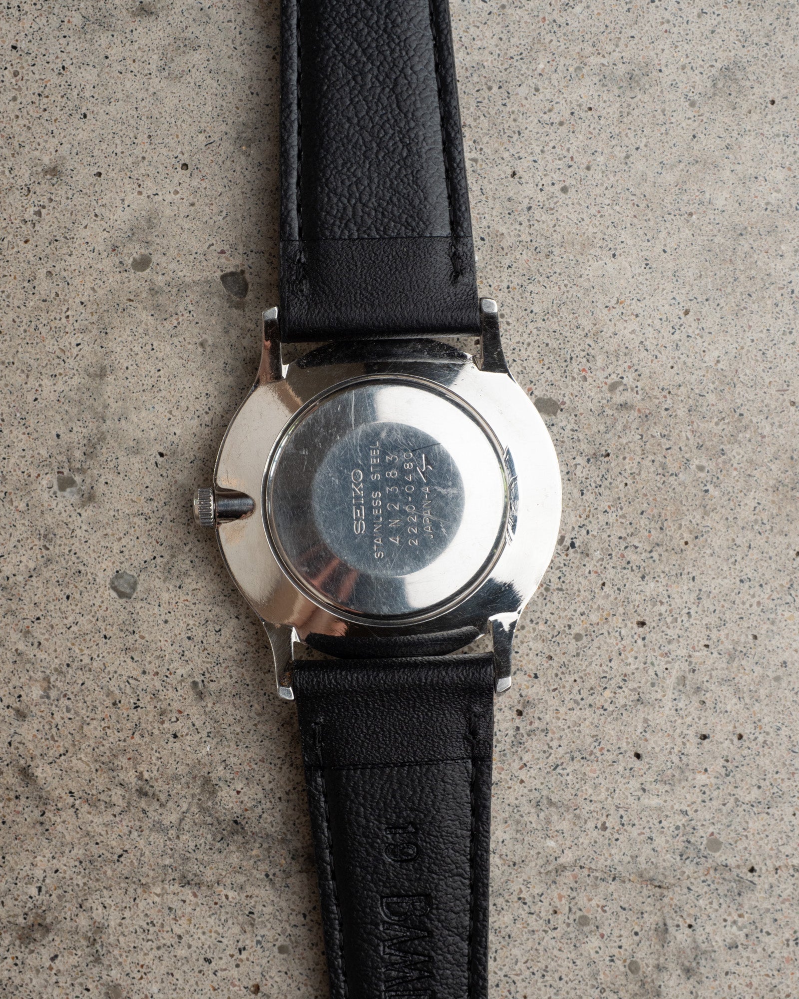 This Seiko Chariot reference 2220-0480 from 1974 is a refined and minimalist dress watch, showcasing the brand’s attention to detail during the golden age of Japanese watchmaking. The 33 mm stainless steel case frames a beautiful silver dial, with a subtle texture that resembles traditional Japanese washi paper. Painted black Roman numerals provide a crisp contrast, giving the dial a timeless elegance. This example has been inspected and regulated by our watchmaker and is running very smoothly. It is fitted with an aftermarket black calf strap and buckle.