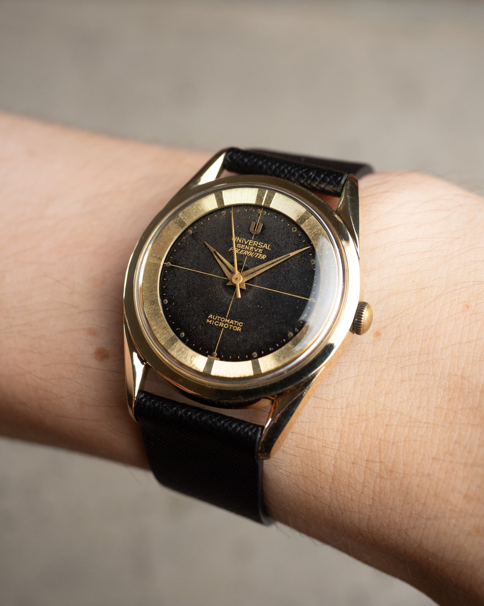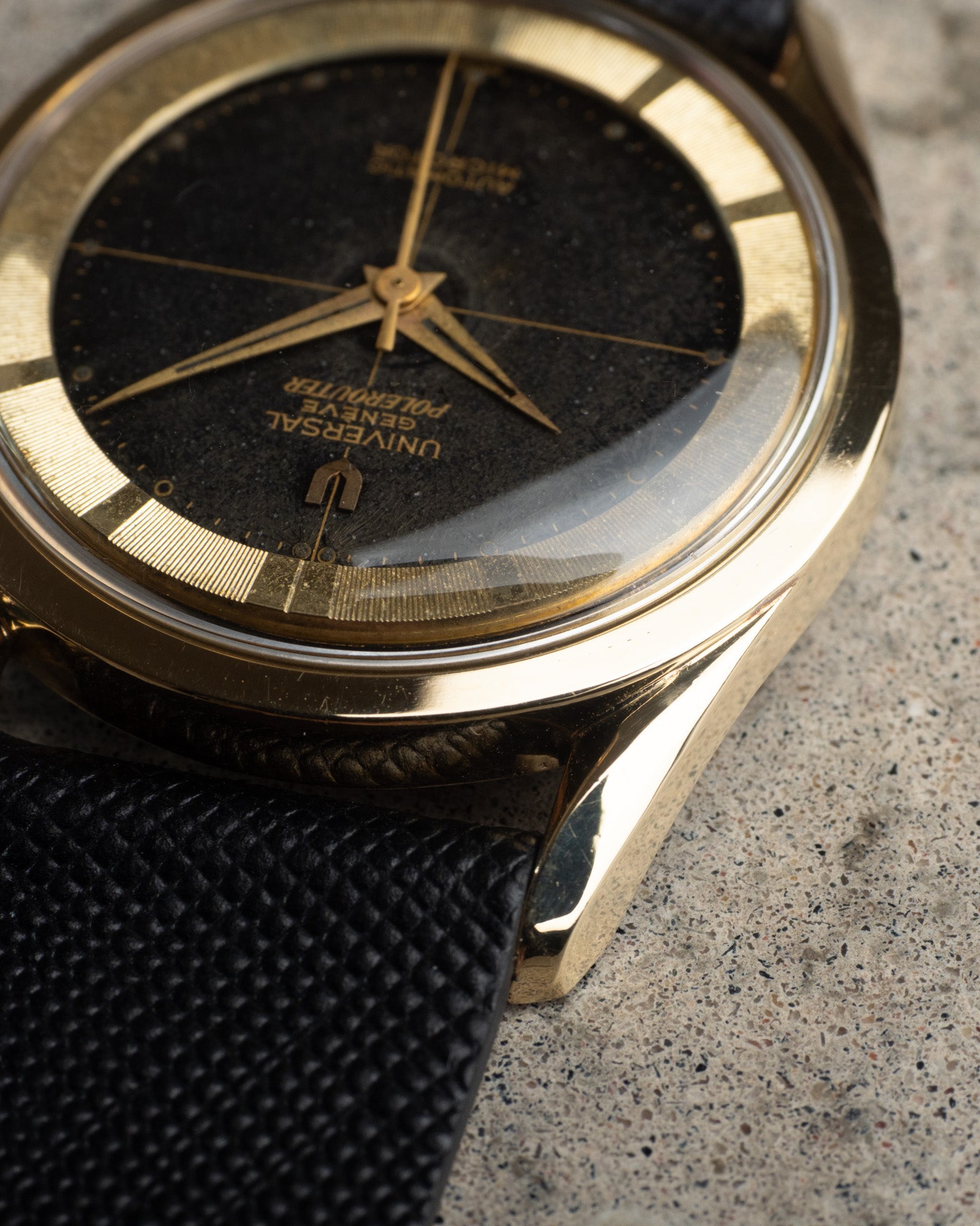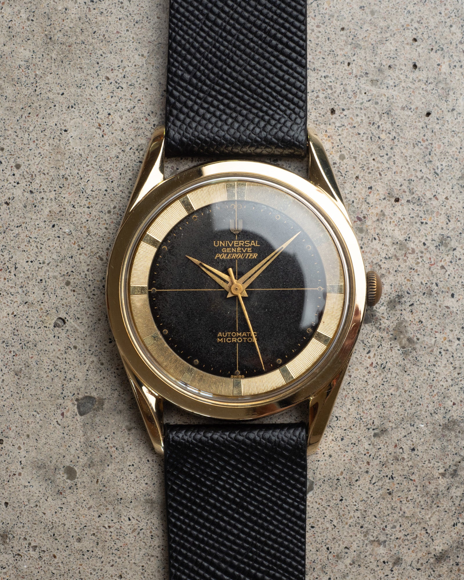 The Polerouter was introduced in 1954 to commemorate Scandinavian Airlines’ polar flights, and it quickly became an icon of 20th-century watchmaking. Beyond its distinctive crosshair dial and clean proportions, the Polerouter holds a technical milestone as one of the first watches to employ a micro rotor automatic movement—an innovation that allowed Universal Genève to produce thinner cases without sacrificing winding efficiency. This no-date example from the late 1950s to early 1960s reflects the model’s most balanced and enduring design, prized by collectors for both its historical importance and timeless elegance.
