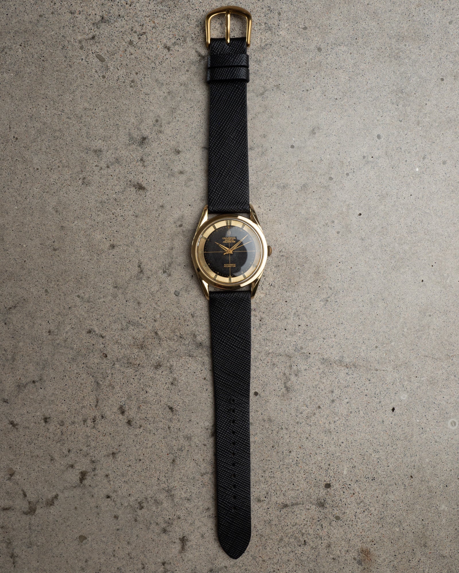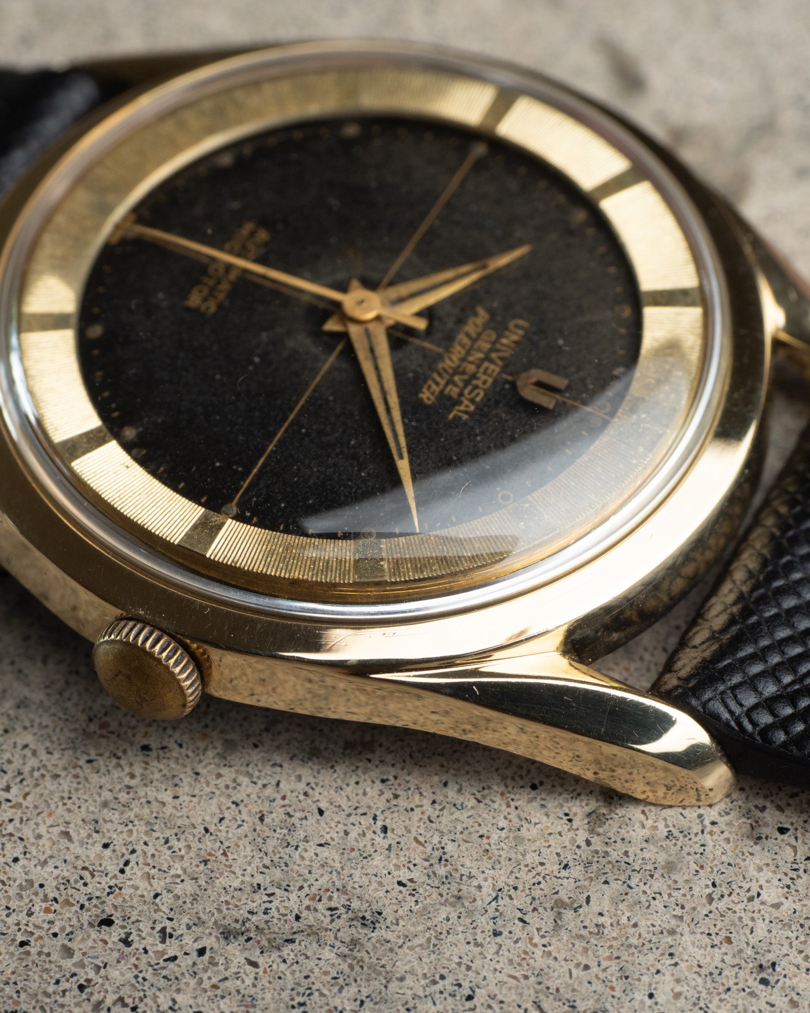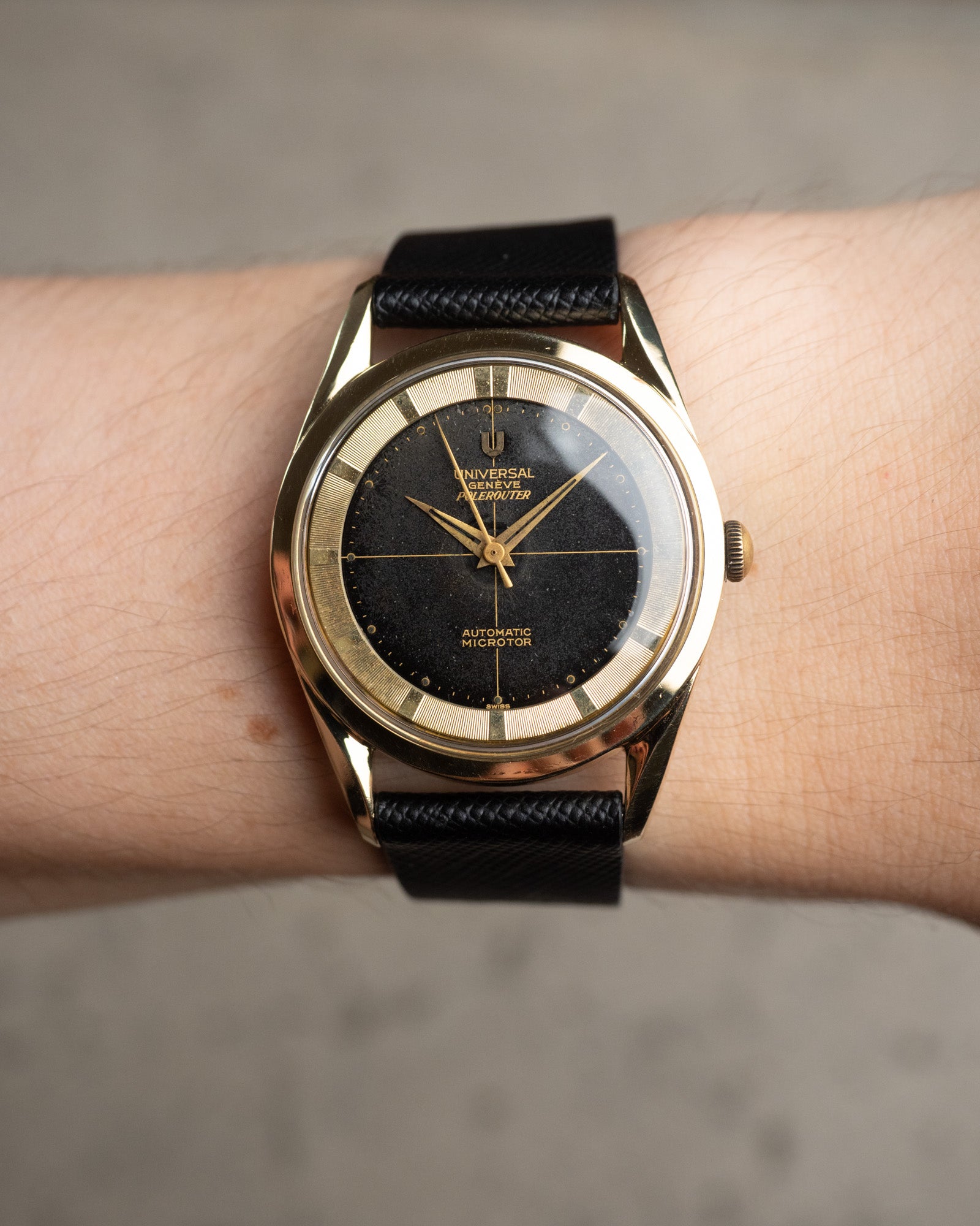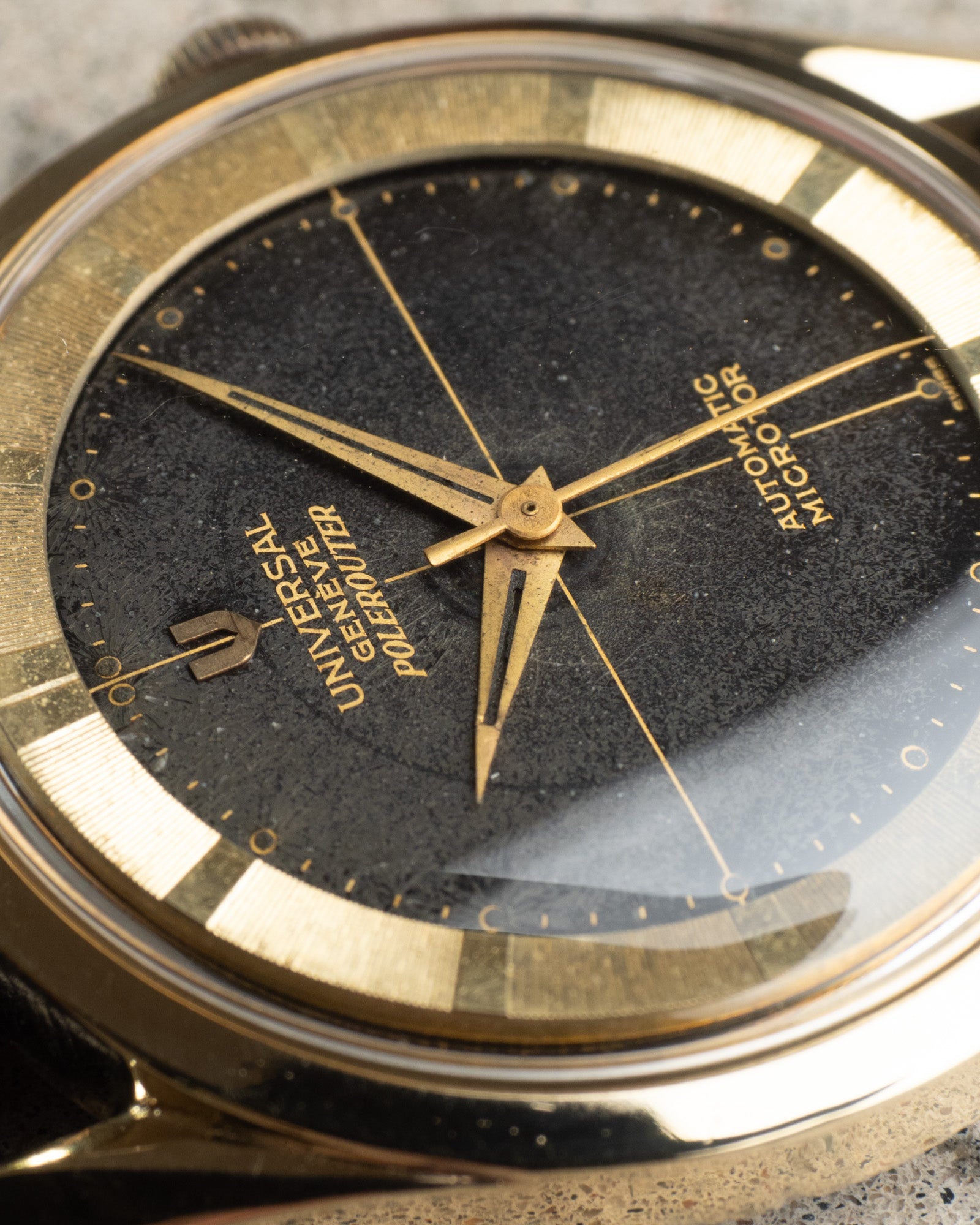 The Polerouter was introduced in 1954 to commemorate Scandinavian Airlines’ polar flights, and it quickly became an icon of 20th-century watchmaking. Beyond its distinctive crosshair dial and clean proportions, the Polerouter holds a technical milestone as one of the first watches to employ a micro rotor automatic movement—an innovation that allowed Universal Genève to produce thinner cases without sacrificing winding efficiency. This no-date example from the late 1950s to early 1960s reflects the model’s most balanced and enduring design, prized by collectors for both its historical importance and timeless elegance.