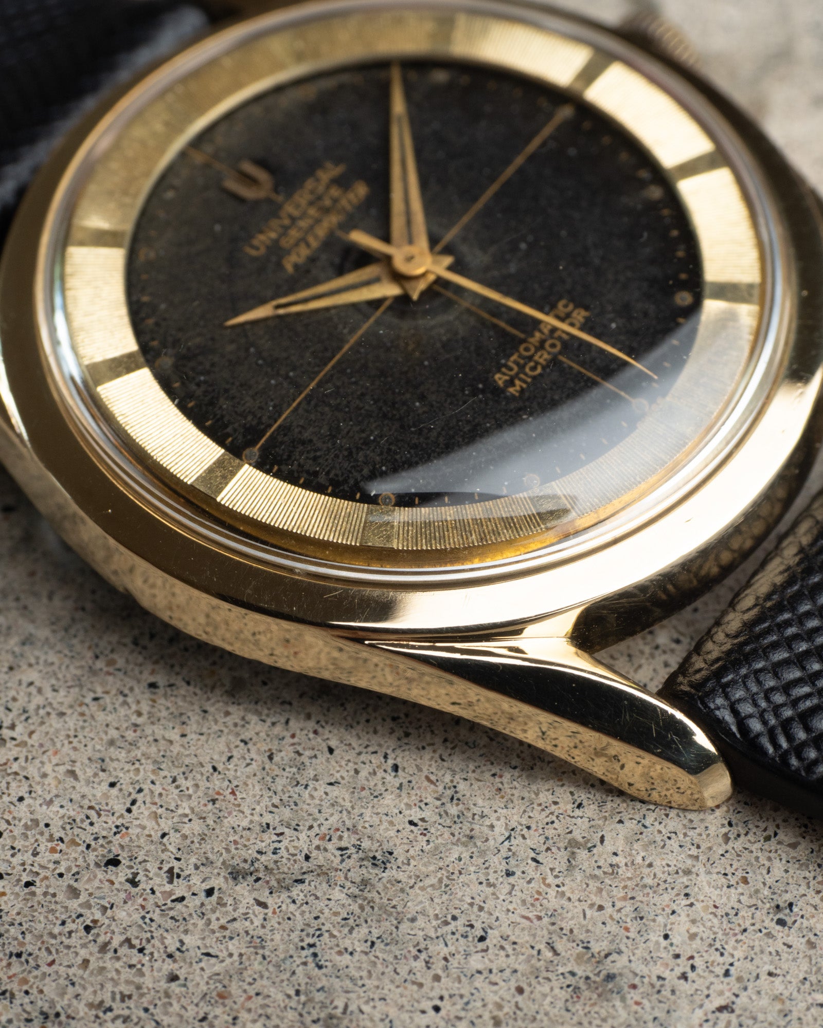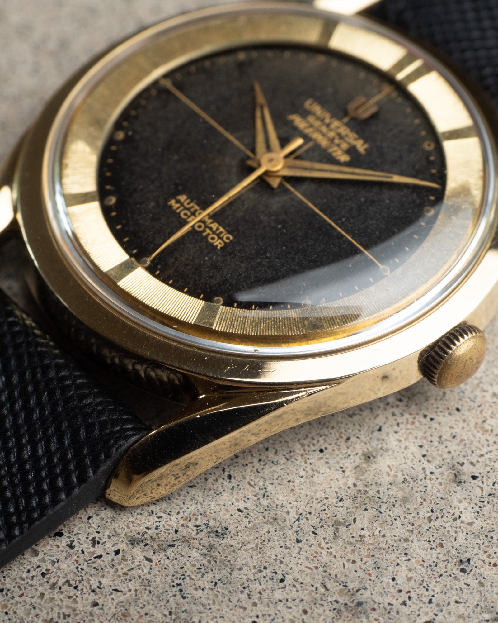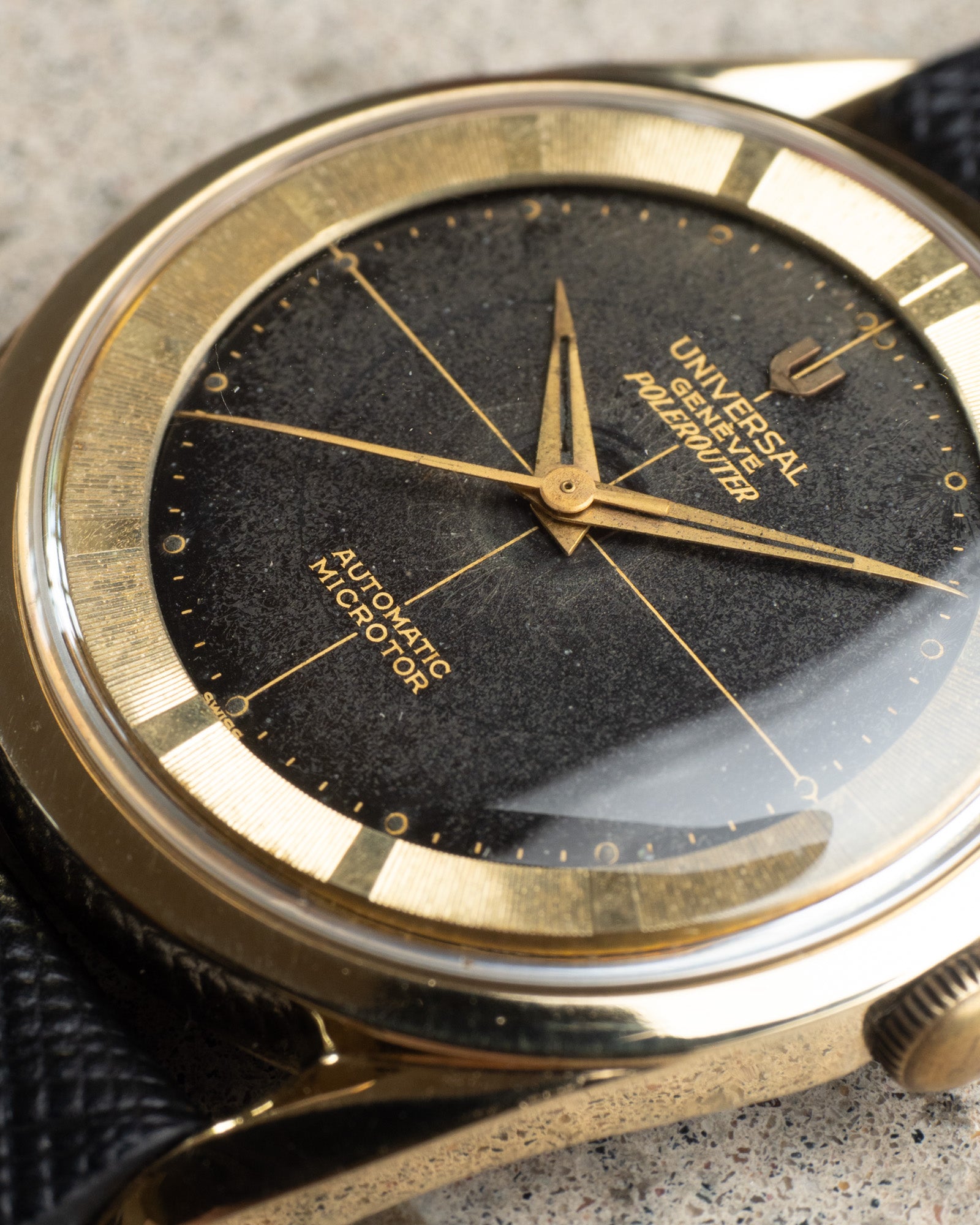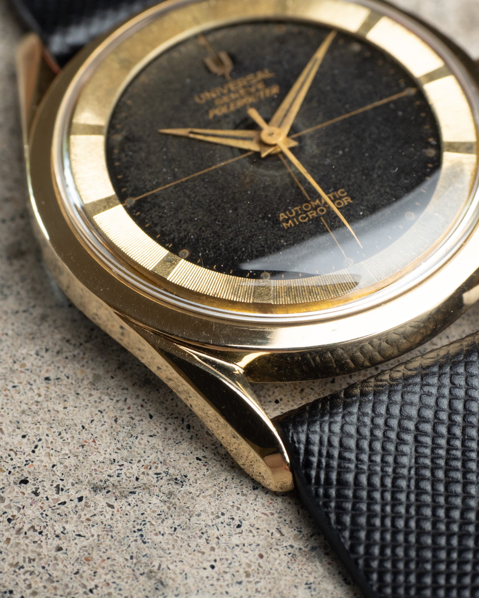 This vintage Universal Genève Polerouter with Microtor movement is a striking example of mid-century Swiss watch design. Measuring 35 mm, it features an elegant black dial that has developed a beautiful natural patina over time, adding depth and character to its original finish. The 18k gold capped case lends a refined presence on the wrist, while the slim profile underscores the visionary work of Gérald Genta, who designed the Polerouter at just 23 years old. Recently serviced and running smoothly, this watch is ready to be enjoyed for years to come.