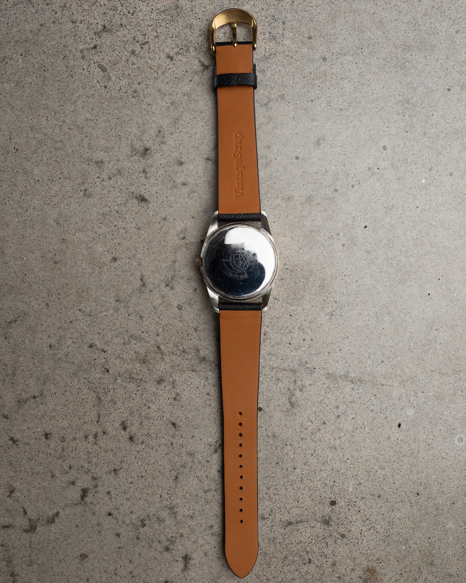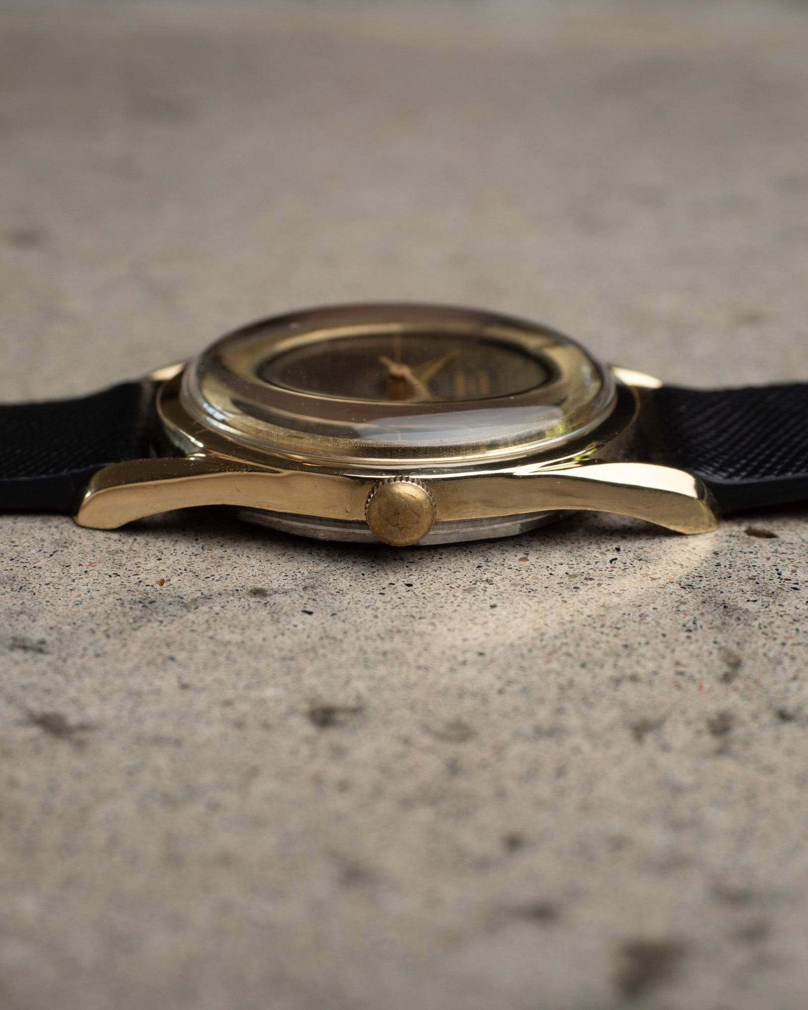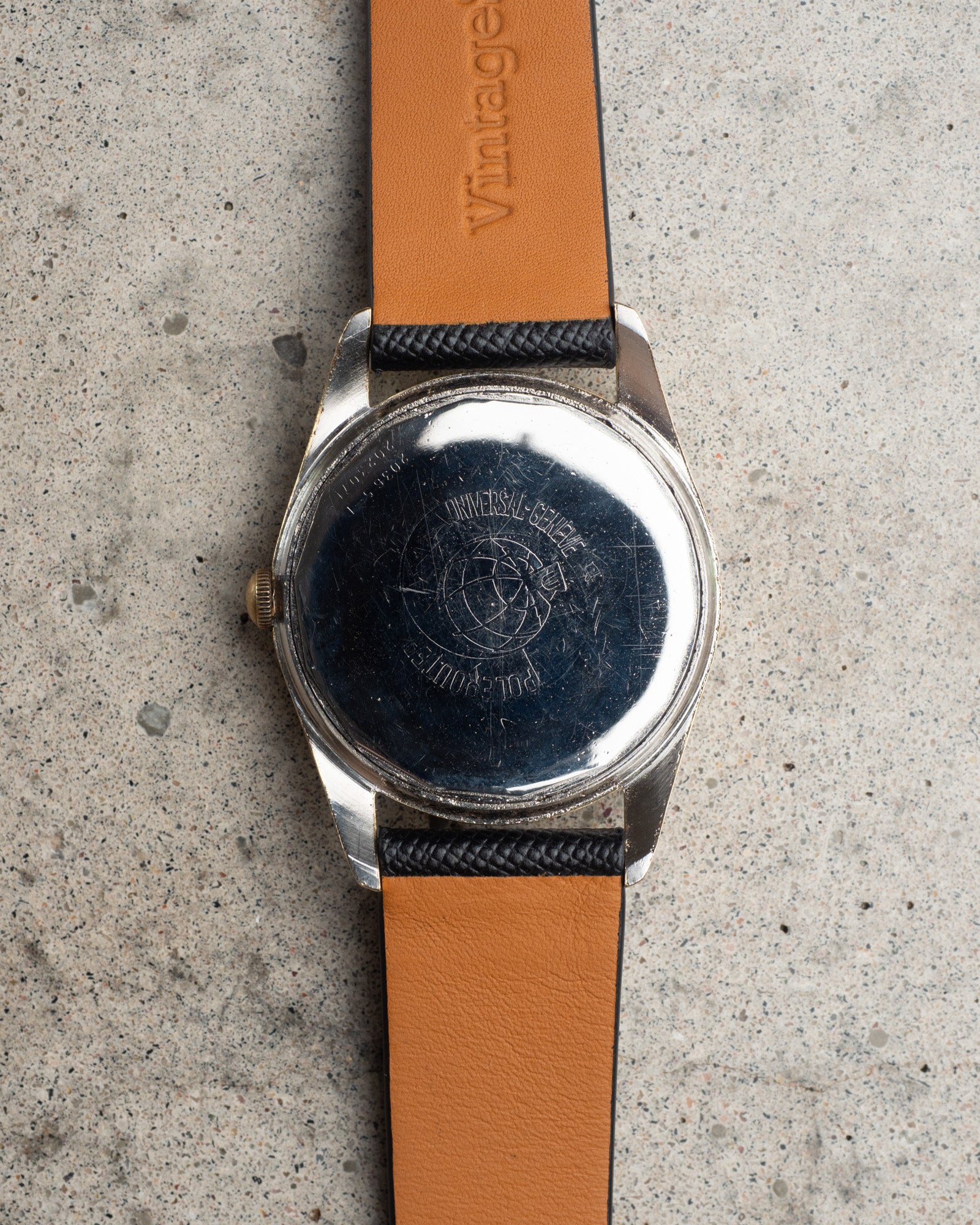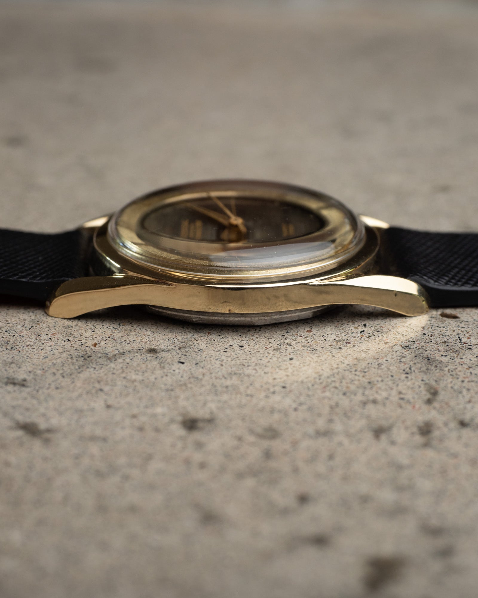 This vintage Universal Genève Polerouter with Microtor movement is a striking example of mid-century Swiss watch design. Measuring 35 mm, it features an elegant black dial that has developed a beautiful natural patina over time, adding depth and character to its original finish. The 18k gold capped case lends a refined presence on the wrist, while the slim profile underscores the visionary work of Gérald Genta, who designed the Polerouter at just 23 years old. Recently serviced and running smoothly, this watch is ready to be enjoyed for years to come.